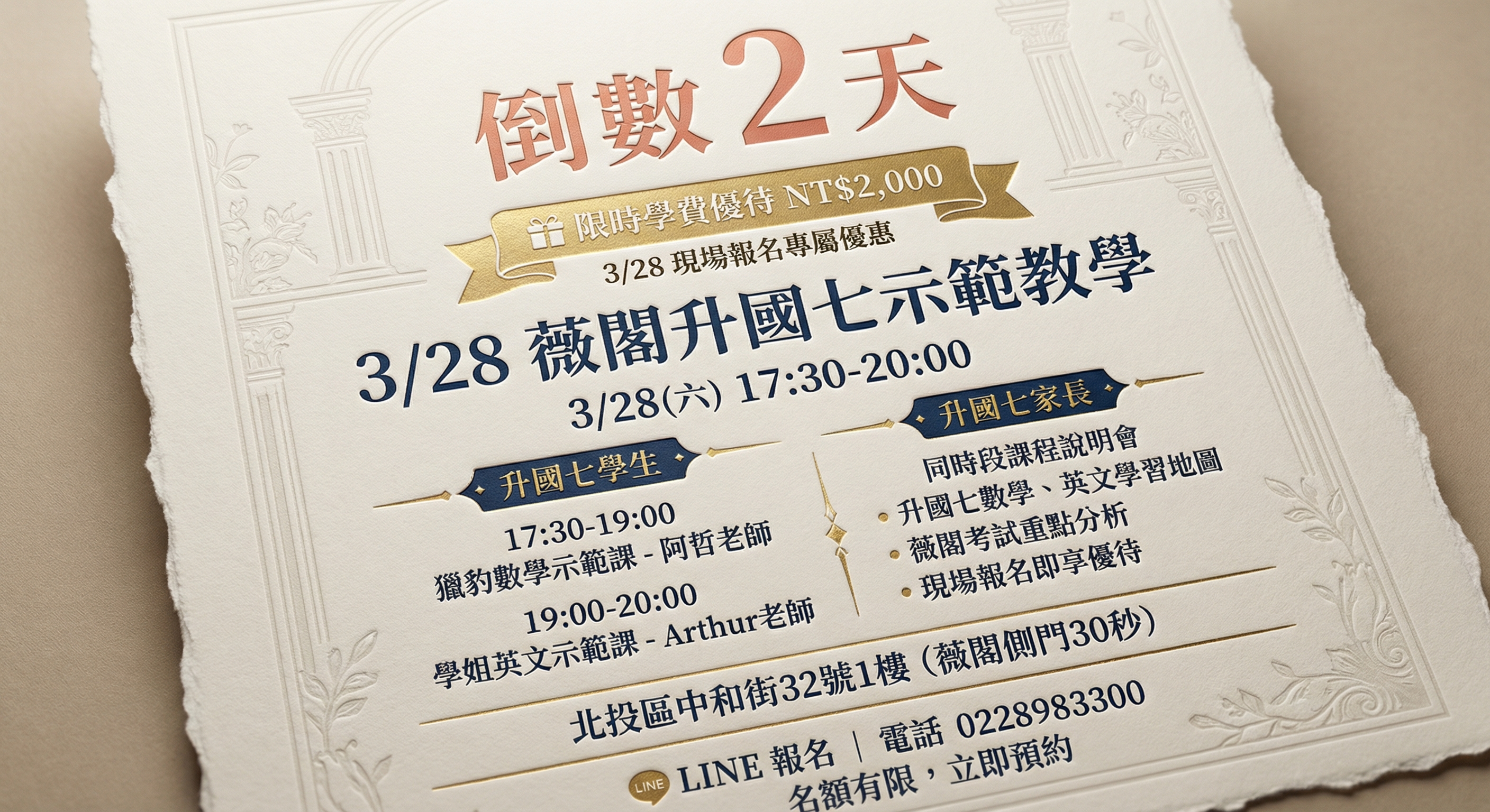 倒數2天!3/28 薇閣升國七示範教學 🎁 限時優待