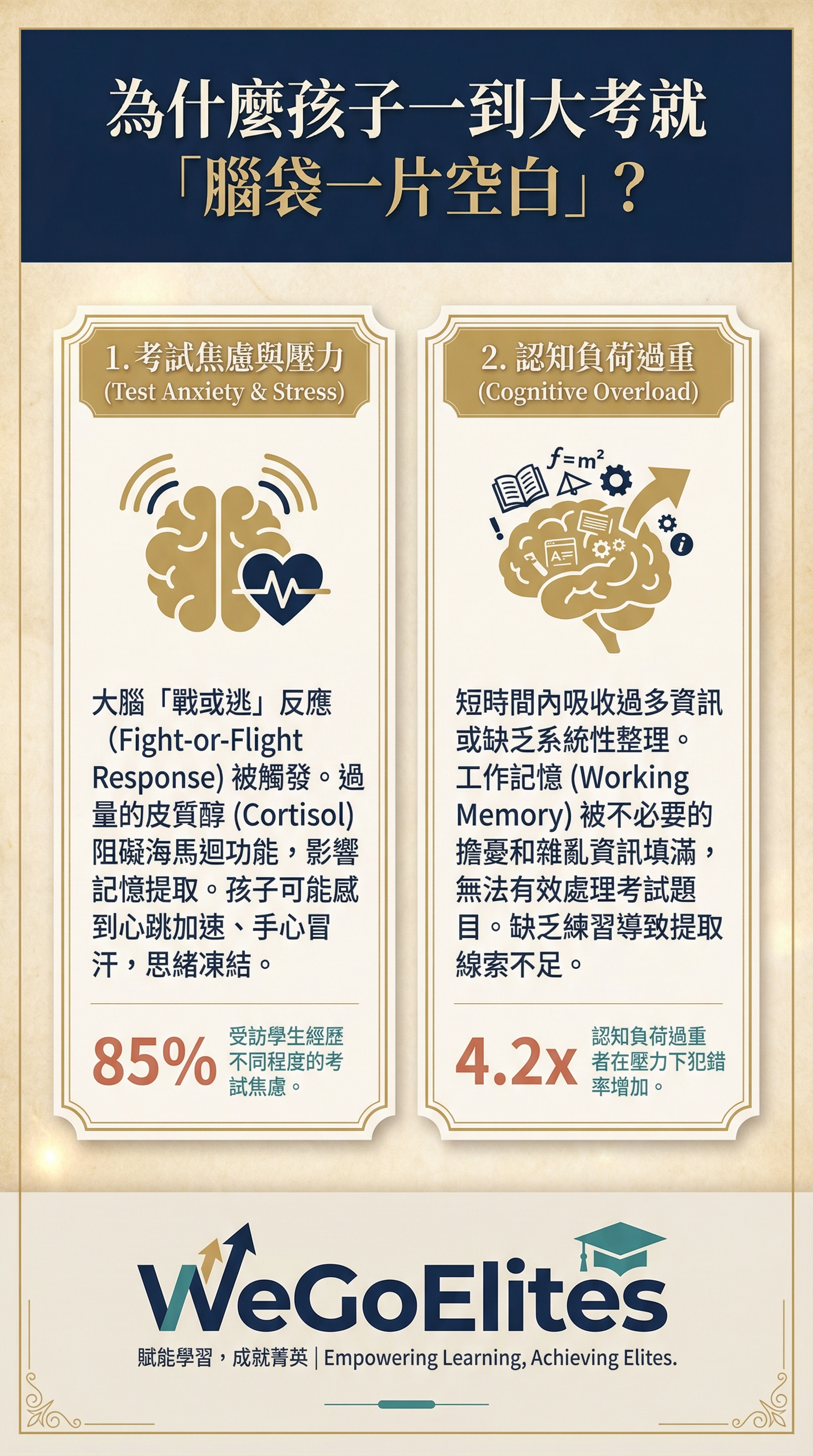 你的大腦有「工作記憶」(working memory),就像電腦的RAM。正常情況下,你的工作記憶可以同時處理4-7個訊息。但考試時,你的大腦要同時處理:
