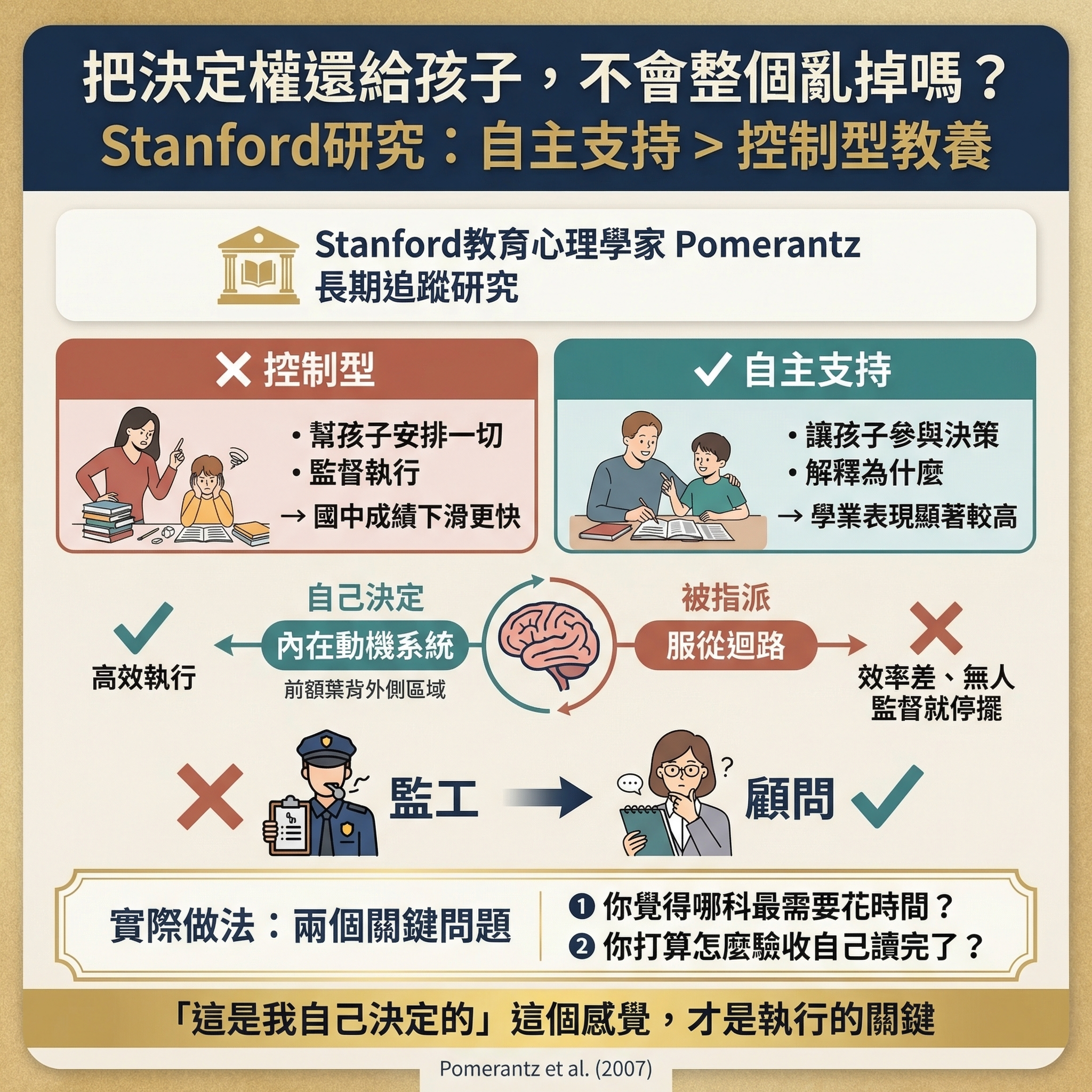 Stanford教育心理學家Pomerantz和她的團隊做了一系列追蹤研究。結論:父母給予「自主支持」(讓孩子參與決策、解釋為什麼要做某件事)的家庭,孩子的學業表現顯著高於「控制型」(幫孩子安排好一切、監督執行)的家庭。