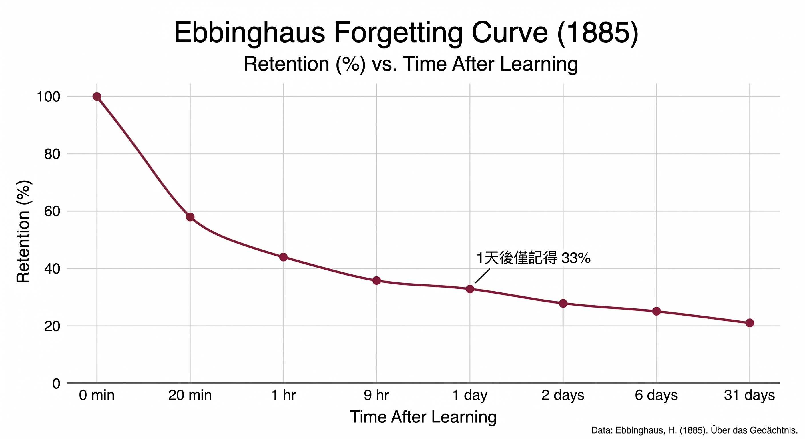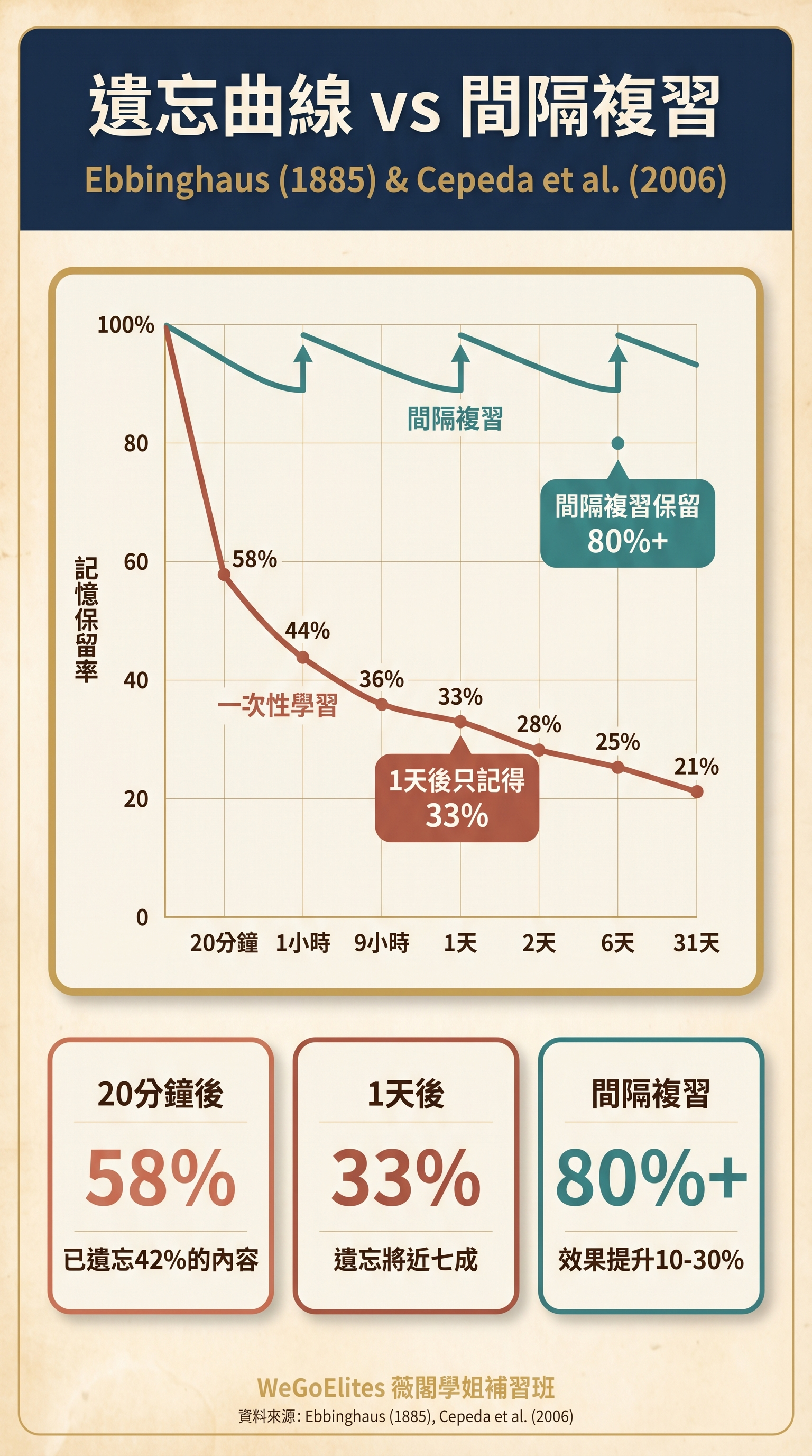 Ebbinghaus(1885)的遺忘曲線研究發現,學習後20分鐘就會遺忘42%的內容,一天後遺忘67%。但Cepeda等人(2006)在Psychological Bulletin的統合分析指出,間隔重複(spaced repetition)比集中學習的長期記憶效果高出10%-30%。原理是每次間隔複習,大腦需要重新提取記憶,這個「費力」的過程反而強化了神經連結。