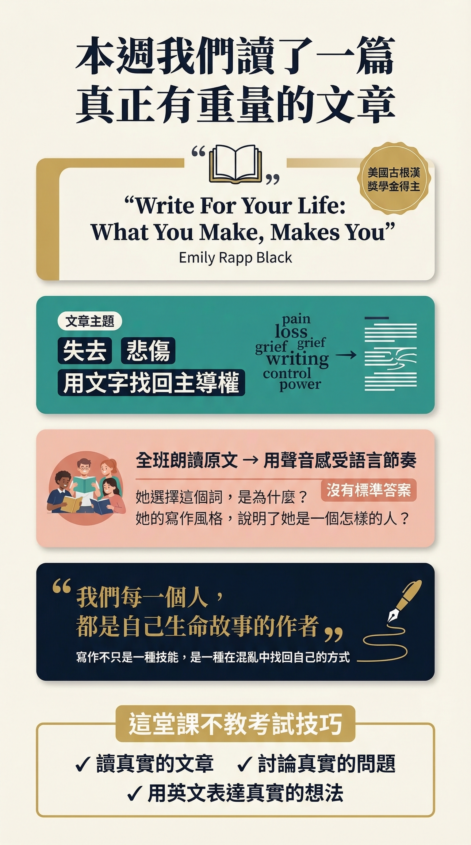 我們讀真實的文章,討論真實的問題,練習用英文表達真實的想法。